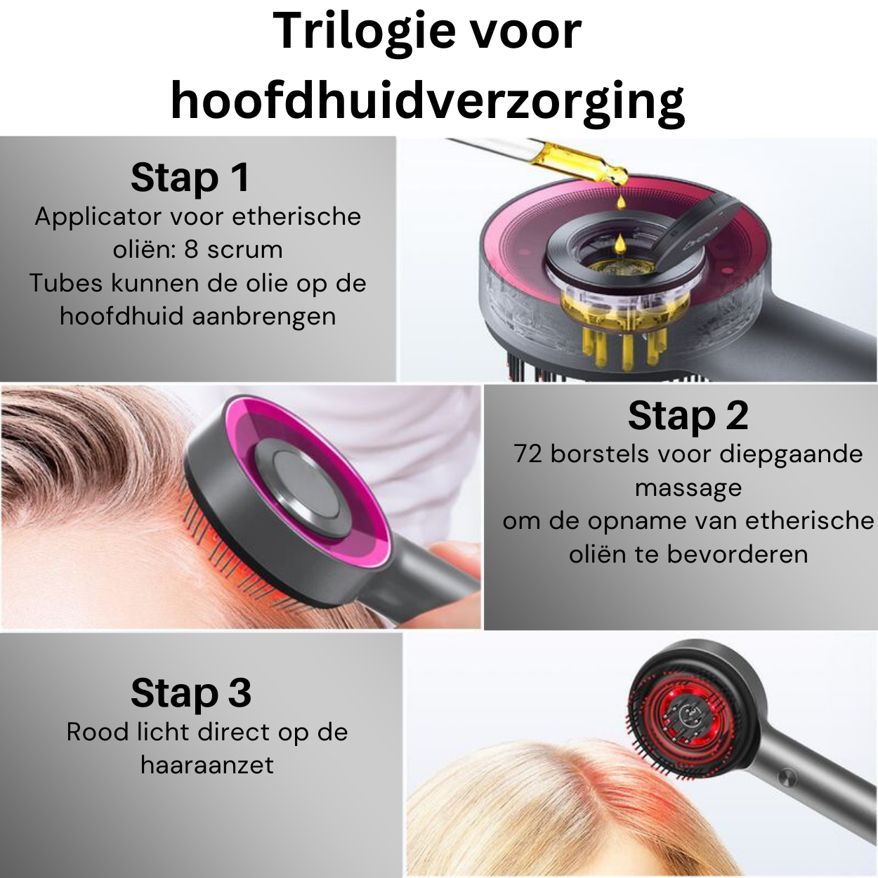 Het apparaat vermindert droogheid en helpt je hoofdhuid sterker en vitaler aan te voelen. Het kalmeert irritaties, stimuleert de doorbloeding en ondersteunt het herstel van de hoofdhuid. Zo voelt je hoofdhuid rustiger aan, wordt de elasticiteit verbeterd en oogt je haar gezonder en voller